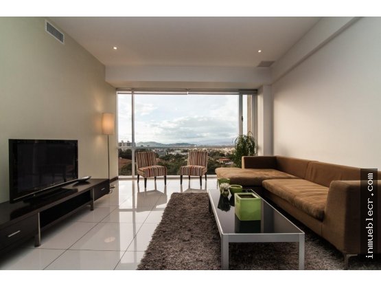 Amplia habitación, walk in closet 1.5 baños Gran sala, amplia cocina Area de lavado 1 parqueo Cielos altos y luz natural Aire acondicionado central Puertas italianas Ventanería de lujo Pisos de Porcelanato y madera Exclusivo Edificio , solo 3 apartamentos por piso Espectacular vista, jardines y senderos Piscina infinity edge y jacuzzi Casa club Parqueo bajo techo. 2 elevadores Generador eléctrico Situado en lo alto de una colina en Escazu. Multiples y excelentes accesos desde Escazu, San José y Santa Ana.