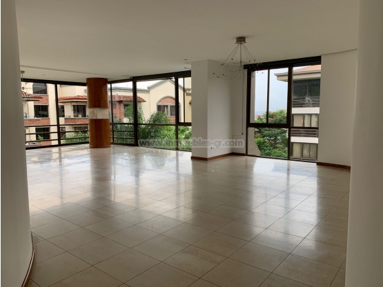 La sala de estar tiene excelente iluminación natural y vista a San José y las montañas. Las áreas sociales están a un lado y las áreas privadas al otro, conectadas por un pasillo con un gran y moderno diseño de iluminación indirecta y una variedad de closets.