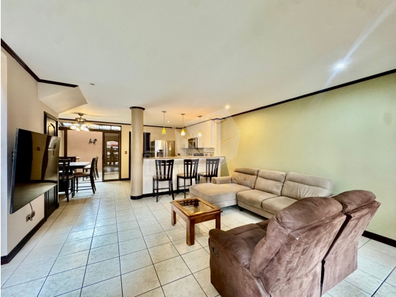 Hermosa casa semi amueblada de dos niveles con excelente distribución en Lindora, Santa Ana: 3 habitaciones (1 de ellas pequeña), la principal con walk in closet, posee amplios closets, sala, comedor, cocina recien remodelada con desayunador, cuarto de pilas, baño de visita, patio.